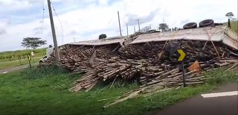 No vídeo, é possível ver o caminhão tombado com diversos troncos espalhados pelo canteiro (assista acima) . A Polícia Militar (PM) foi acionada e esteve no local.