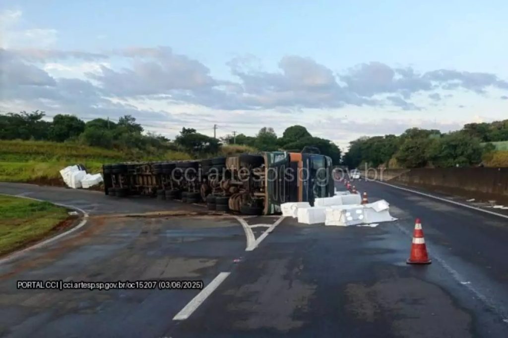 Parte da carga transportada, composta por celulose, ficou espalhada na via. A previsão, segundo informações obtidas no local, era de que as operações para a retirada do caminhão e limpeza da pista se estendessem durante toda a manhã.